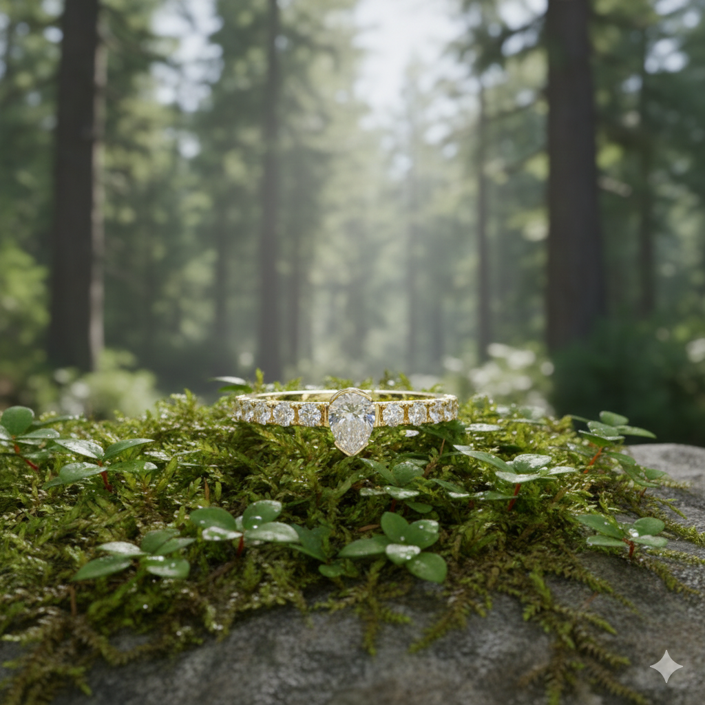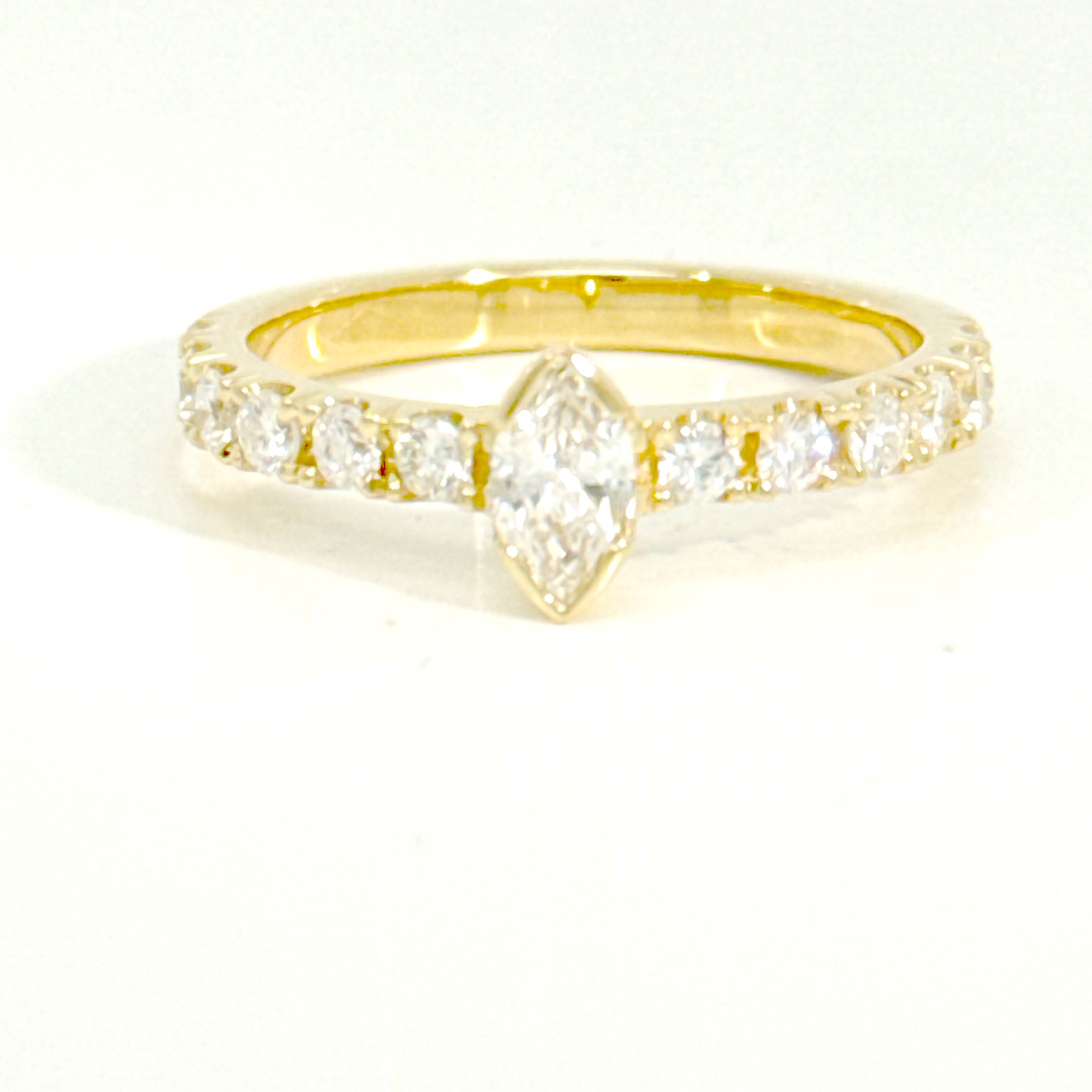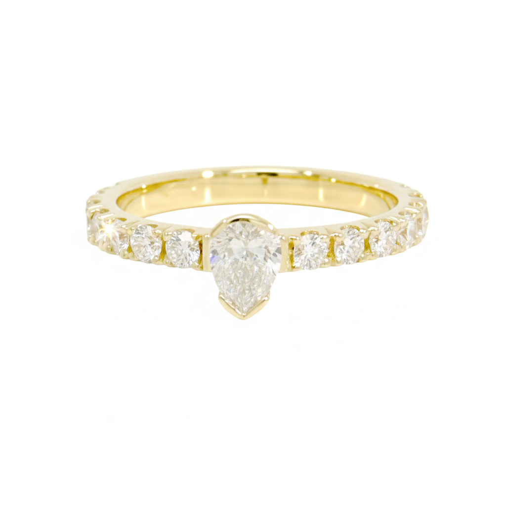 18 karaat geel gouden ring met centrale peer diamant 0.34ct en briljanten in band 0.0.56ct