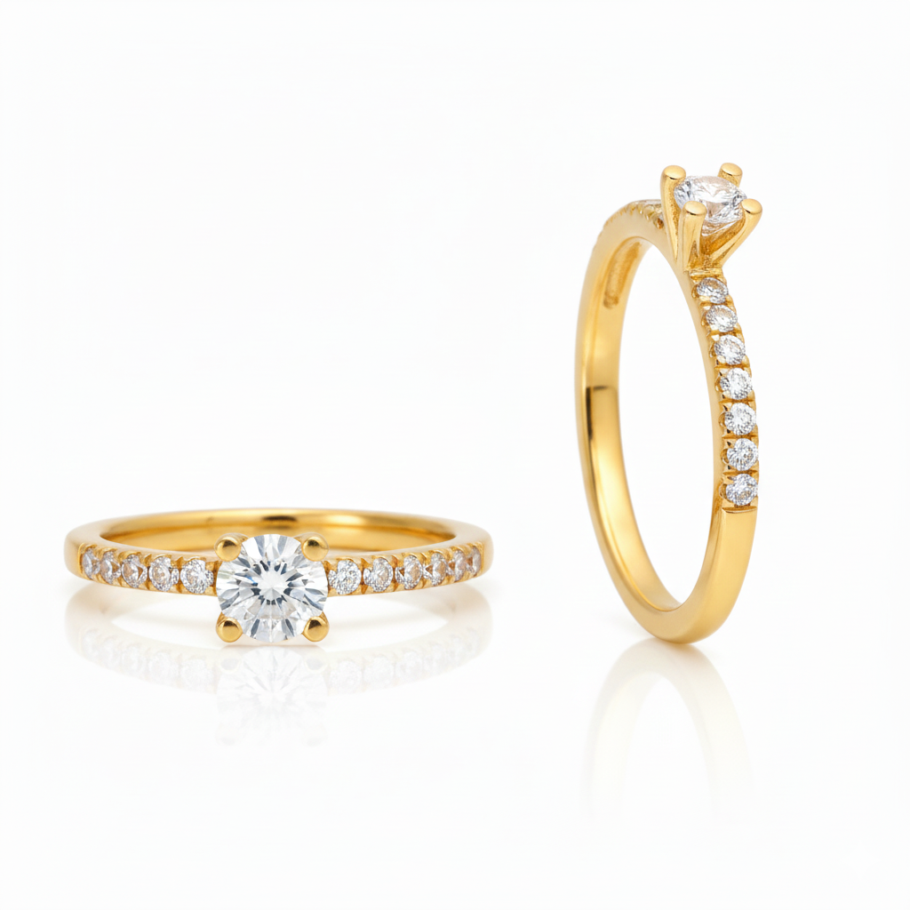 18kt gg verlovingsring met 0.09ct brilj centraal en 0.18ct brilj zijkanten