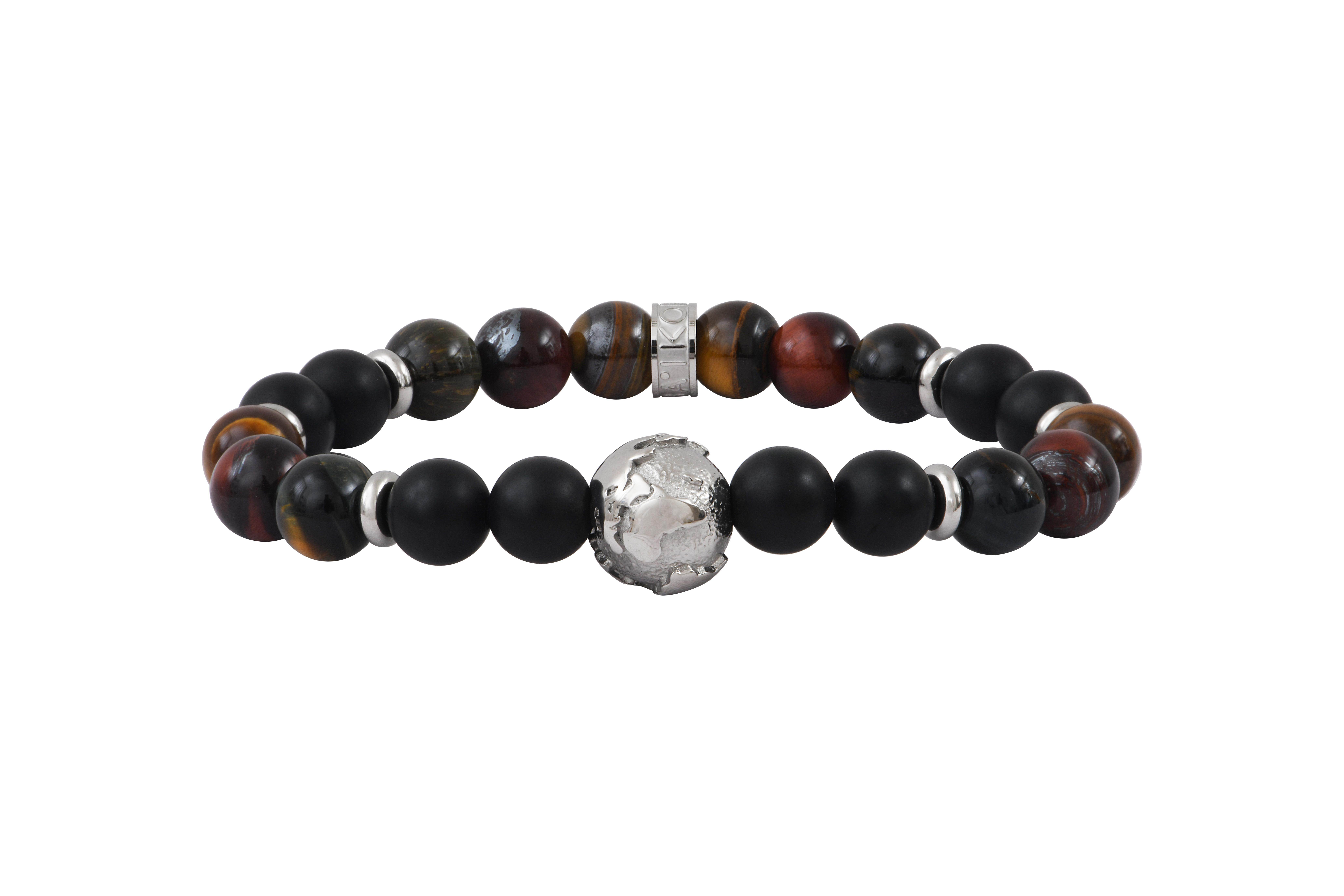 Armband met aarde bol zilver en stalen cirkel ikoba met 3 soorten tijgeroog: stier,tijger en valk