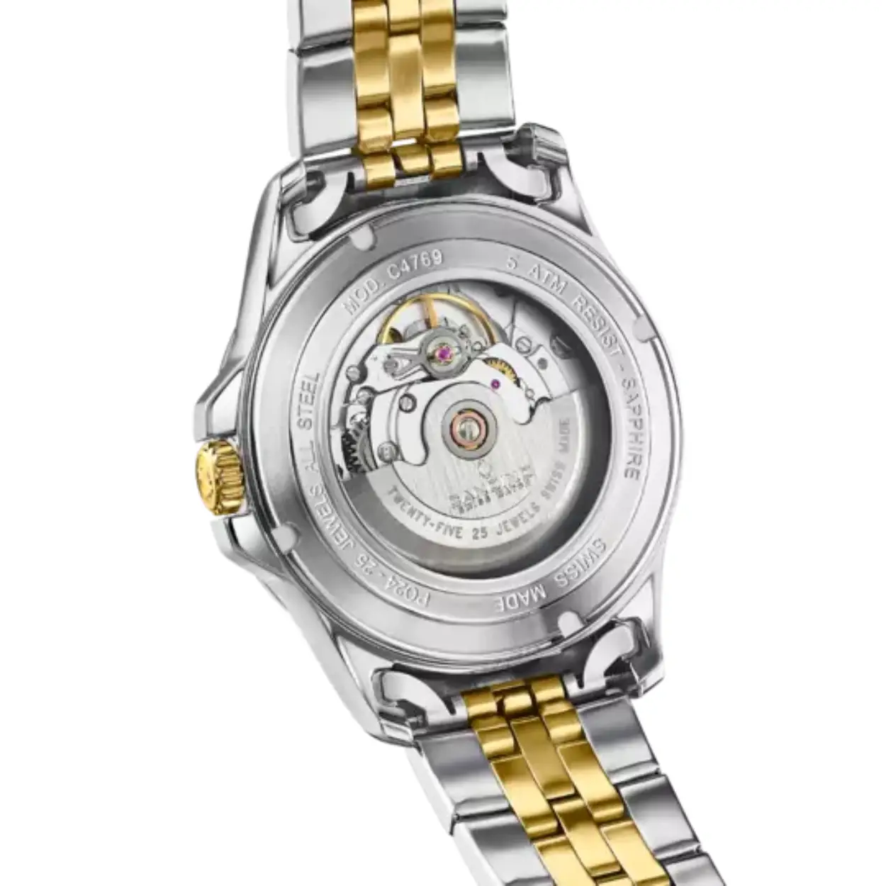 Dit horloge is uitgerust met een band van bicolor roestvrij staal en een Hiermee kan de grootte van de band eenvoudig en nauwkeurig worden aangepast, zodat het horloge perfect om uw pols past.