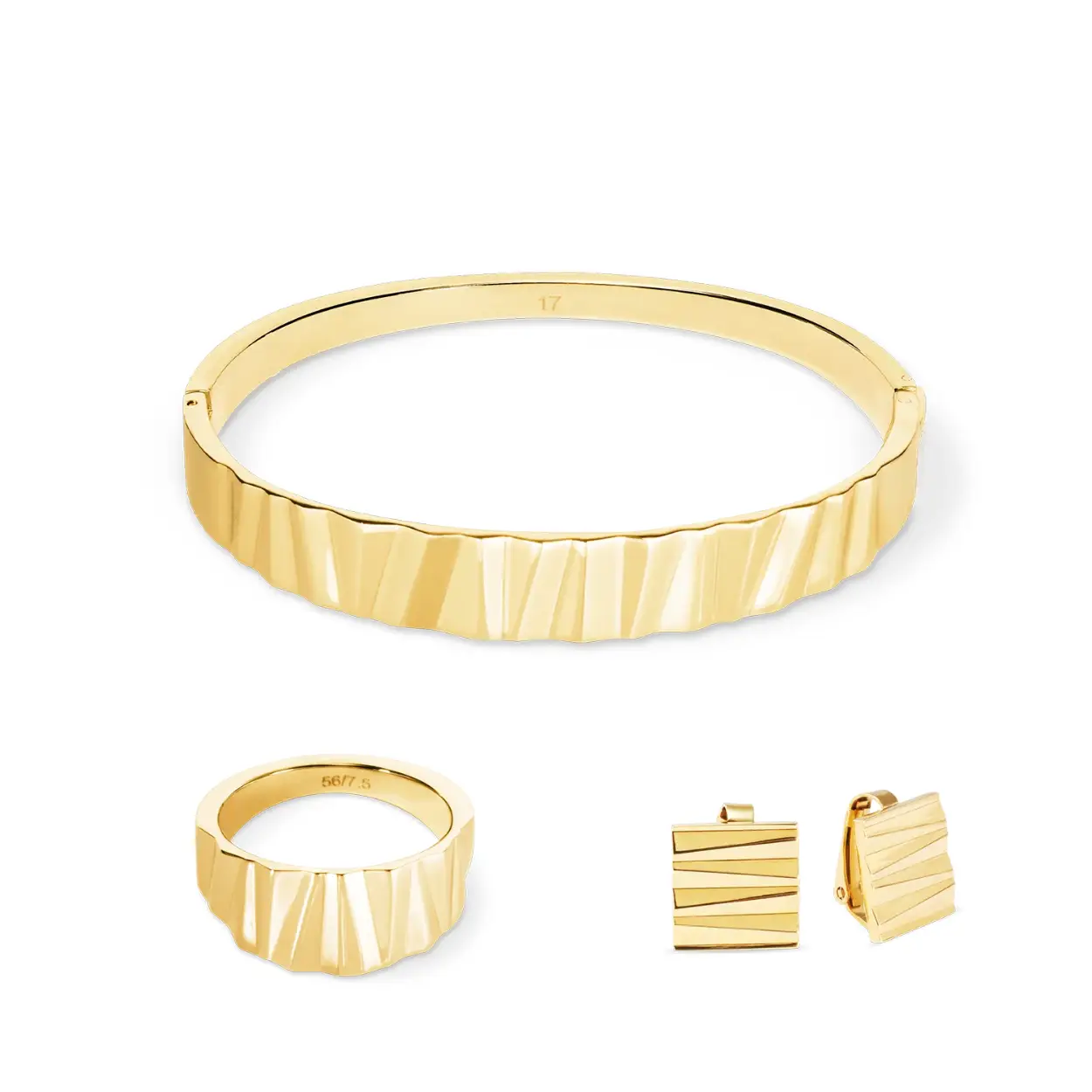 Deze Classic Wave Gold-armband brengt beweging in je sieradenspel! De vloeiende golfstructuur zorgt voor een bijzondere lichtreflectie. terwijl hoogwaardig roestvrij staal in warm goud elegantie aan je look toevoegt. Of je hem nu alleen draagt ​​of als laagje. deze armband is altijd een hoogtepunt.