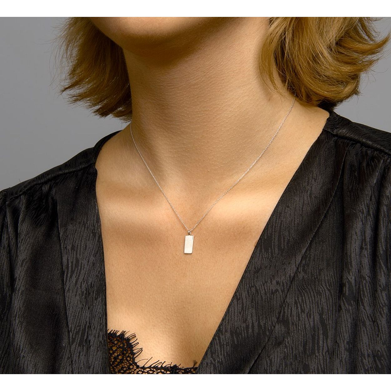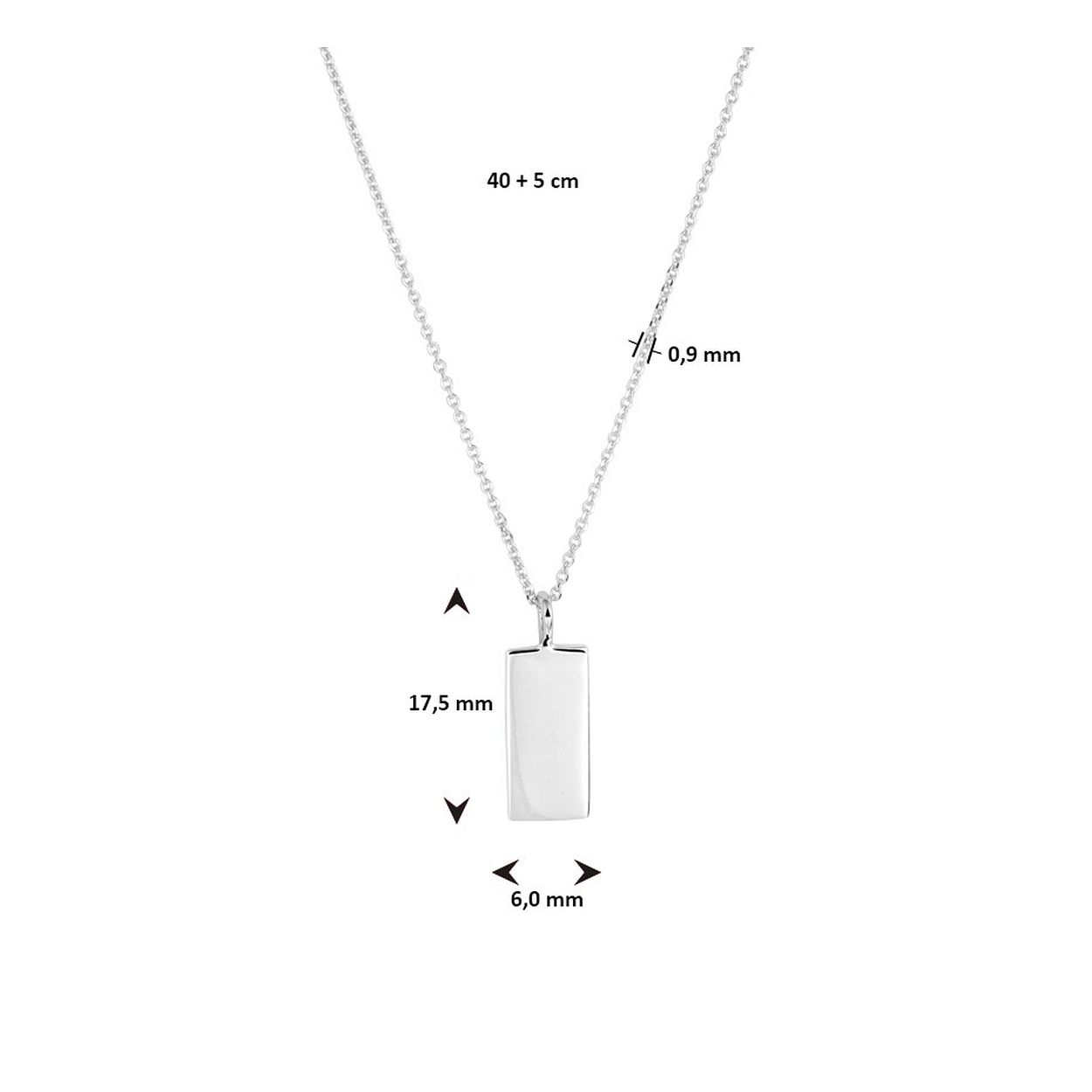 Gerhodineerd 925 zilveren collier uitgevoerd met een hangertje in de vorm van een rechthoek. Het collier heeft een draaglengte van 40cm met een extensie van 5cm en een stevige karabijn sluiting. Het hangertje heeft een afmeting van 17.5x6mm.