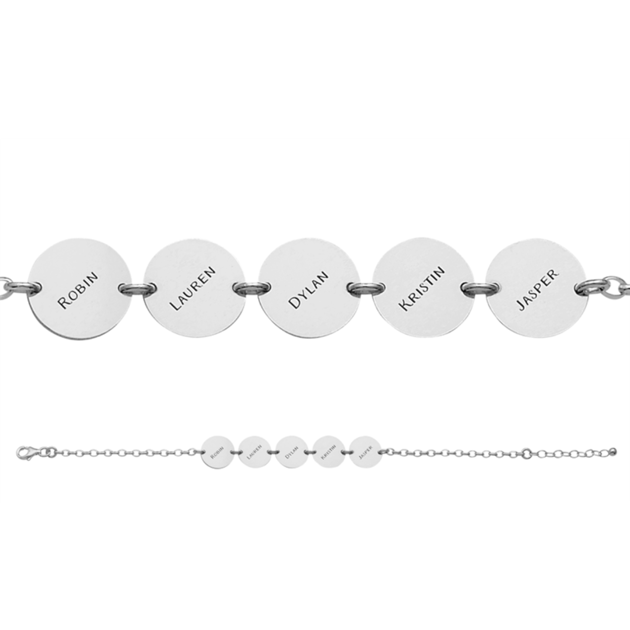 Deze zilveren naamarmband heeft mooie rondjes die met 5 namen gepersonaliseerd kunnen worden.  Op de plaatjes kunnen tot 10 tekens worden gegraveerd. De afmetingen zin 12 x 12 mm. De dikte is 0.7 mm.  De armband heeft een lengte van 17 – 20 cm. Het kan dus in veel verschillende lengtes gedragen worden.  Deze armband is gemaakt van 925 Sterling zilver. maar is ook leverbaar in goud.