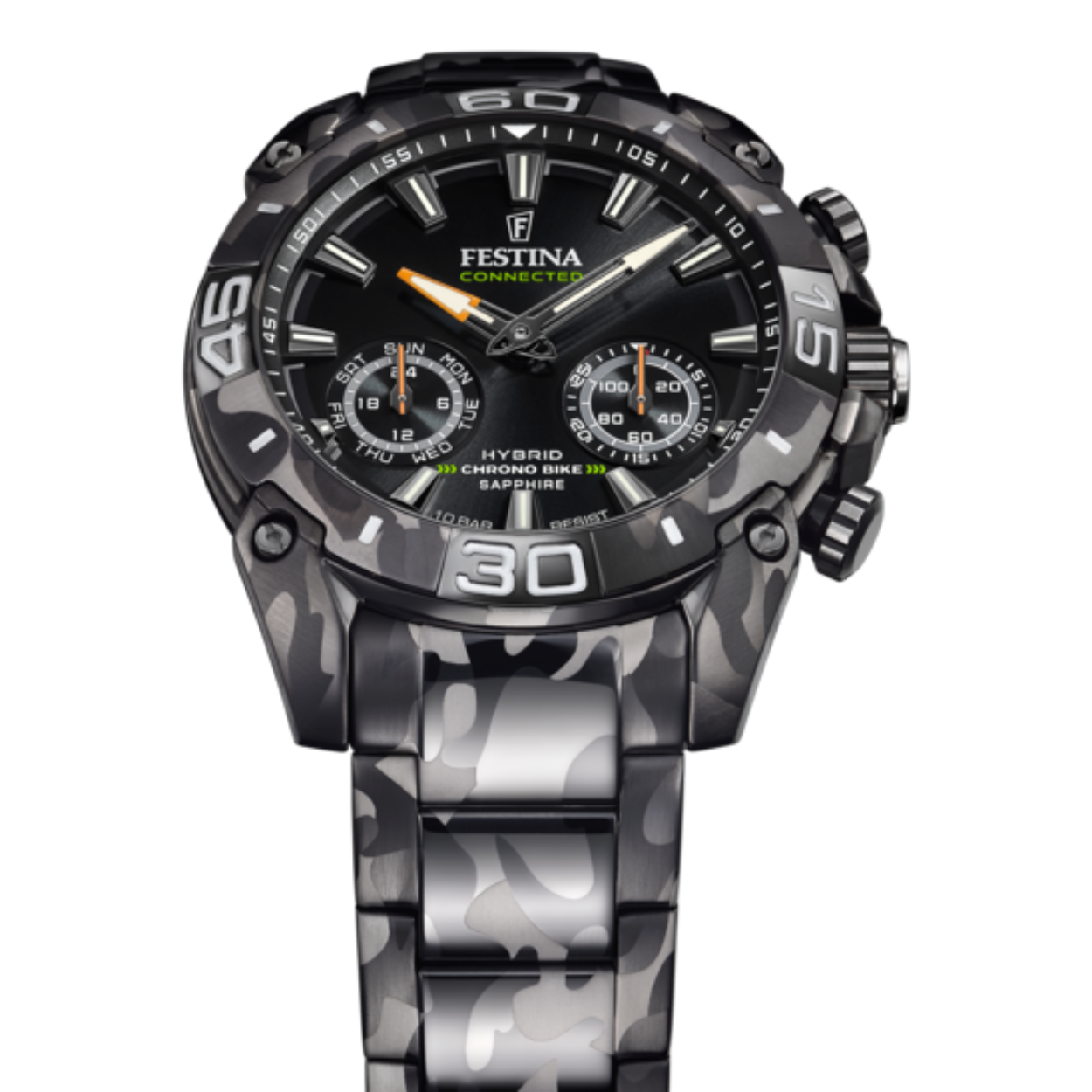 Festina herenuurwerk uit de 'Chrono Bike' collectie - SPECIAL CONNECTED EDITION: Gebruik je uurwerk zoals een normaal uurwerk of verbind het met je smartphone en geniet van alle functies van een smartwatch - Stalen band en kast in camouflagekleuren - Zwarte wijzerplaat 'multifunctie' - Saffierglas - Waterdichtheid: 10 ATM - Verpakt in een mooi koffertje met extra rubberen band in camouflagekleuren
