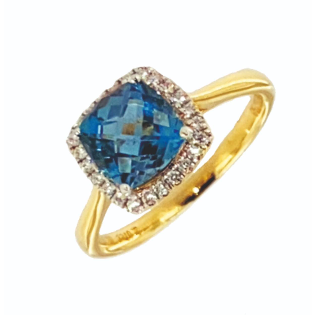 Geel gouden ring met licht blauwe topaas 2.2ct en 0.36ct brilj