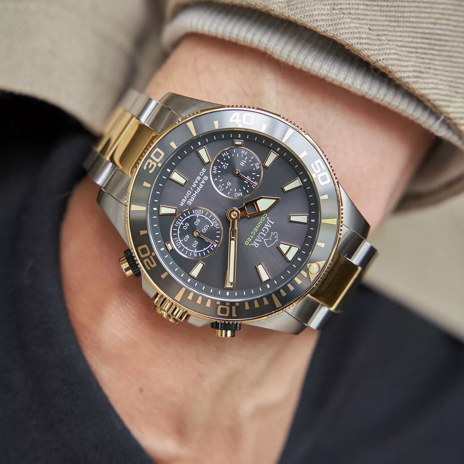 Het model J889/4, in de kleur grijs, met een grijze wijzerplaat en gouden indexen, biedt perfecte leesbaarheid dankzij het saffierglas.