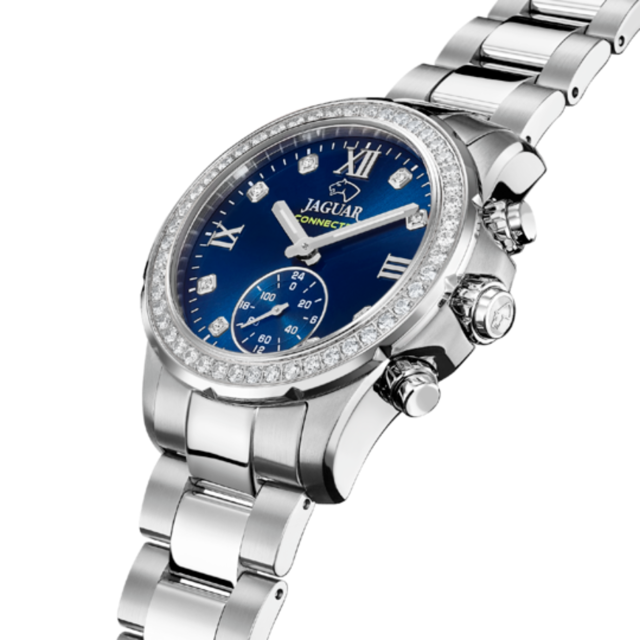 horloge voor dames, collectie Jaguar Connected Lady met blauwe wijzerplaat.