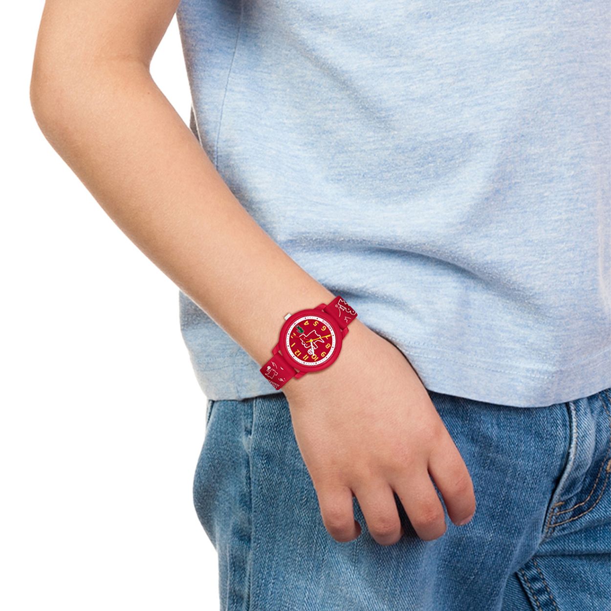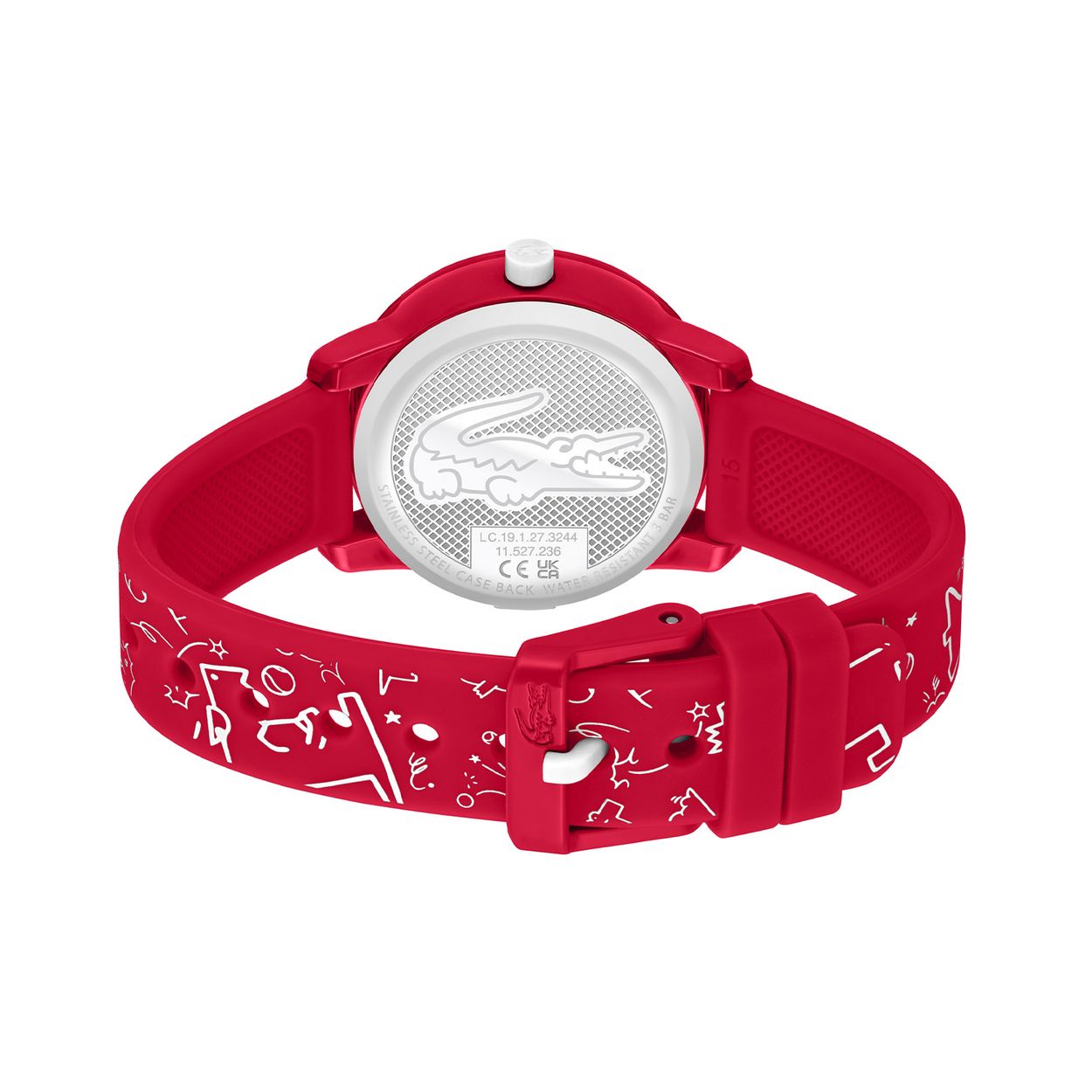 Dit kinderhorloge uit de Lacoste LACOSTE.12.12 KIDS serie met artikelnr. LC2030059 is een sportief en kleurrijk horloge om de tijd op te leren. Het rode kunststof kastje heeft een rode wijzerplaat met duidelijke witte cijfers, kleurrijke accenten, een mineraalglas, is 32mm en 5ATM. Getekende witte krokodillen op de wijzerplaat en op de rode siliconen band maken het heel speels.