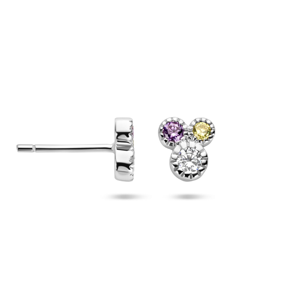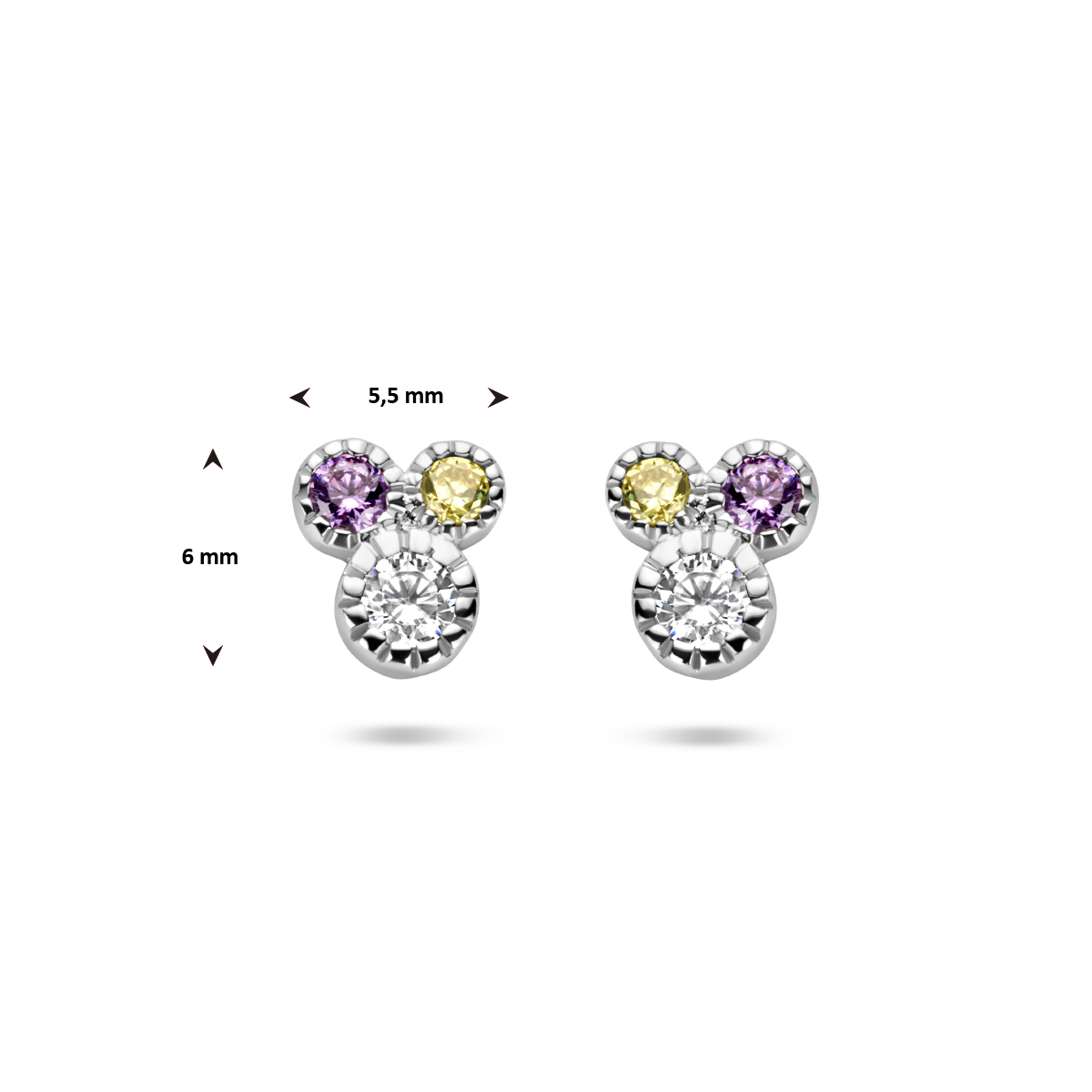 Gerhodineerd 925 zilveren oorknoppen uitgevoerd met zirkonia in drie verschillende kleuren: wit, peridot en amethist. De oorknoppen hebben een afmeting van 6x5.5mm.