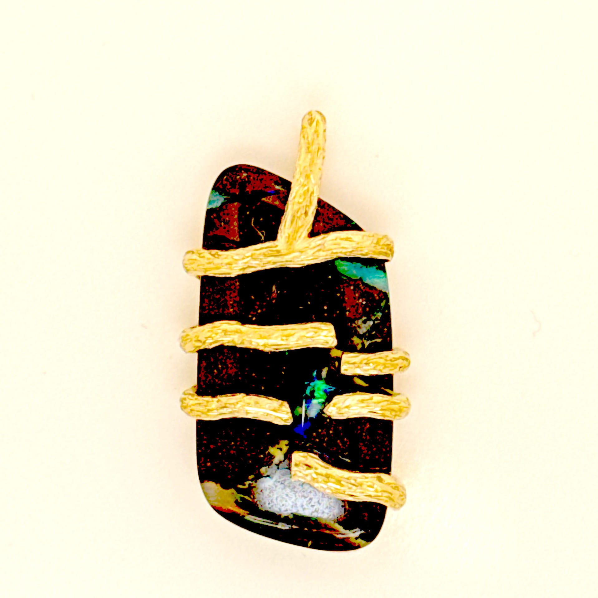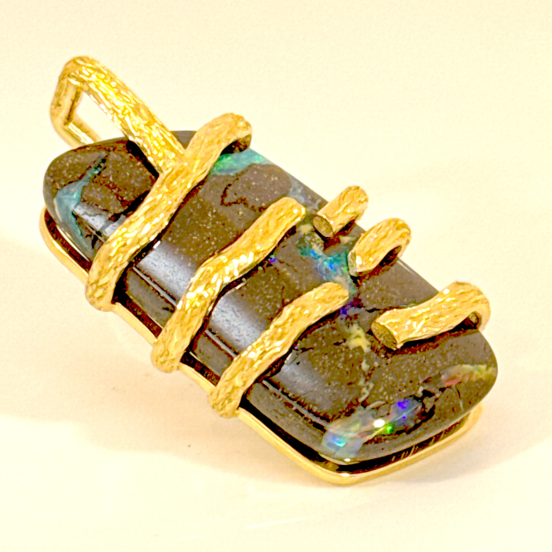 De hanger is gemaakt uit 18kt geel goud met een bolder opal van australië