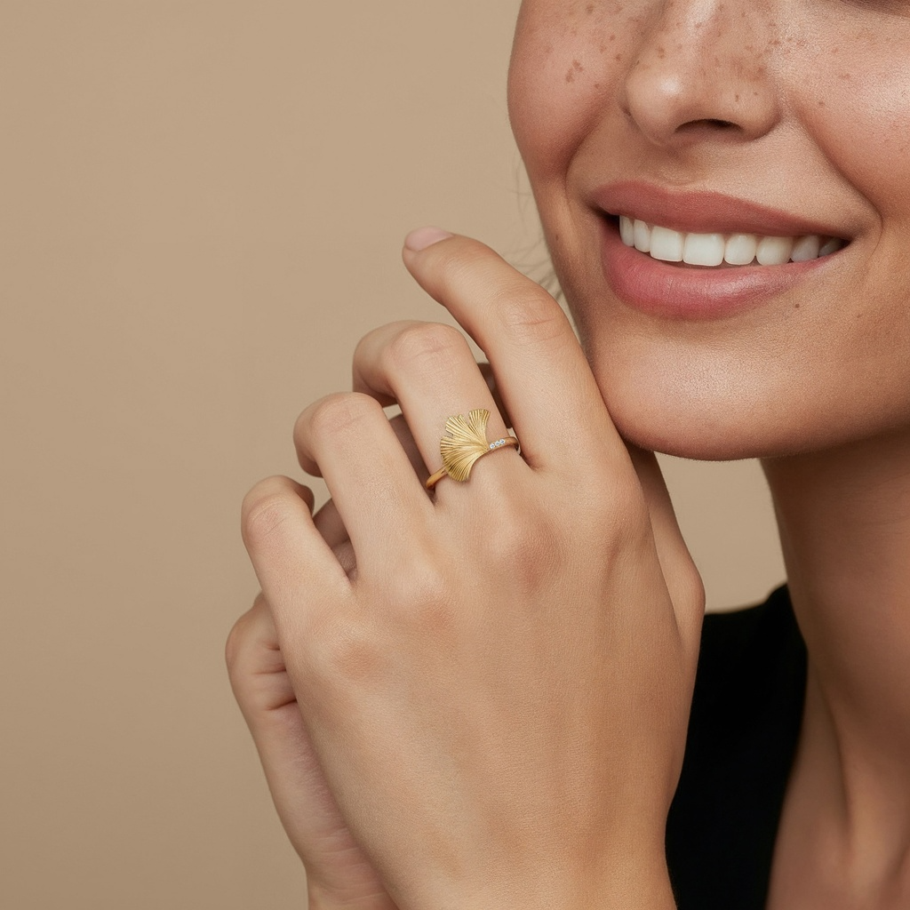 Ring goudkleurig zilver vorm van een Ginkgo blad met diamant