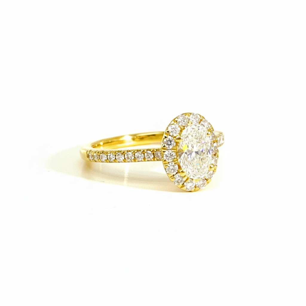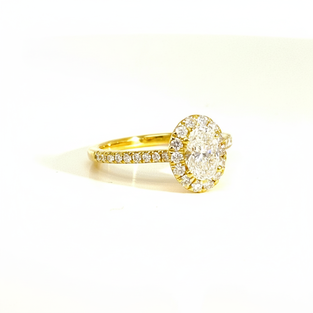 ring in 18kt geel goud met Lab grown ovale slijp 0.78ct en verder bezet met briljant van 0.01ct (totaal 0.43ct) Deze ring is een echte "wedfit" verlovingsring. met andere woorden: een trouwring past er naadloos naast.