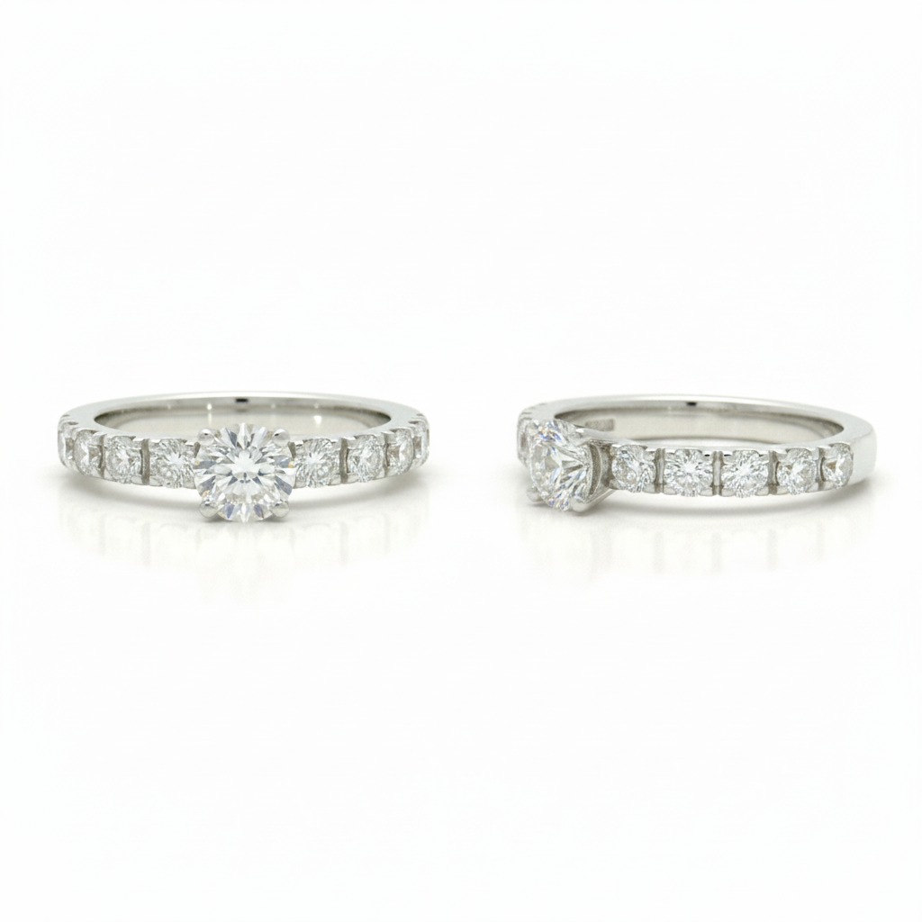 solitair wg 0.32ct + 0.6ct Unieke verlovingsring in 18 karaat witgoud Een tijdloos symbool van liefde. met een centrale briljant van 0.32 karaat die elegant omringd wordt door 10 schitterende zijstenen van telkens 0.06 karaat. Deze ring is een exclusieve eigen creatie – ontworpen met oog voor detail en met het hart als kompas. Een uniek juweel voor een uniek moment.