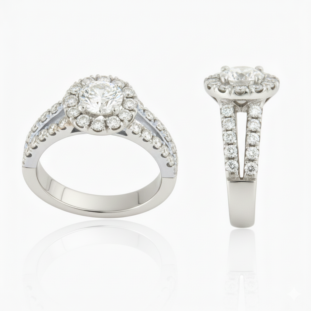 witgouden solitair 18kteigen creatie1ct centrale diamant (briljant) H/Vs1 met certificaat HRD en lasergravurebriljant van 0.03ct in band en rond de centrale steen 1.11ct