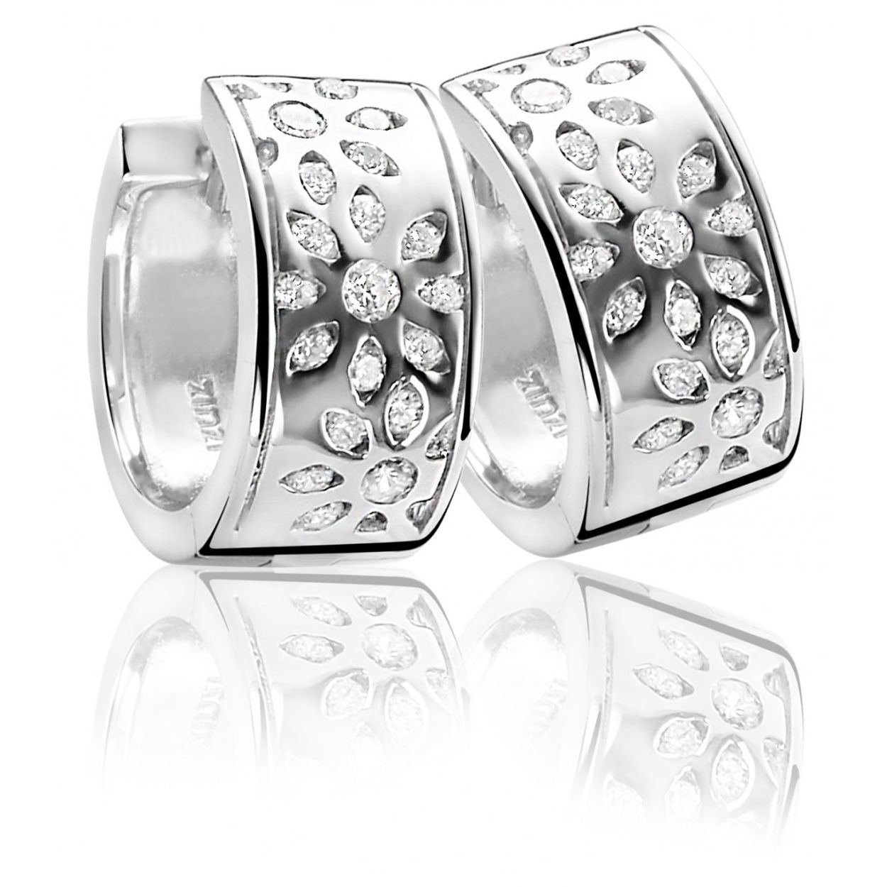 ZINZI zilveren klapcreolen zirconia bloemmotief 14x7mm. Vervaardigd van eerste gehalte zilver (925) en voorzien van een extra rodium laag voor een langdurige glans. Afmeting:  14 x 2 x 6,5 mm